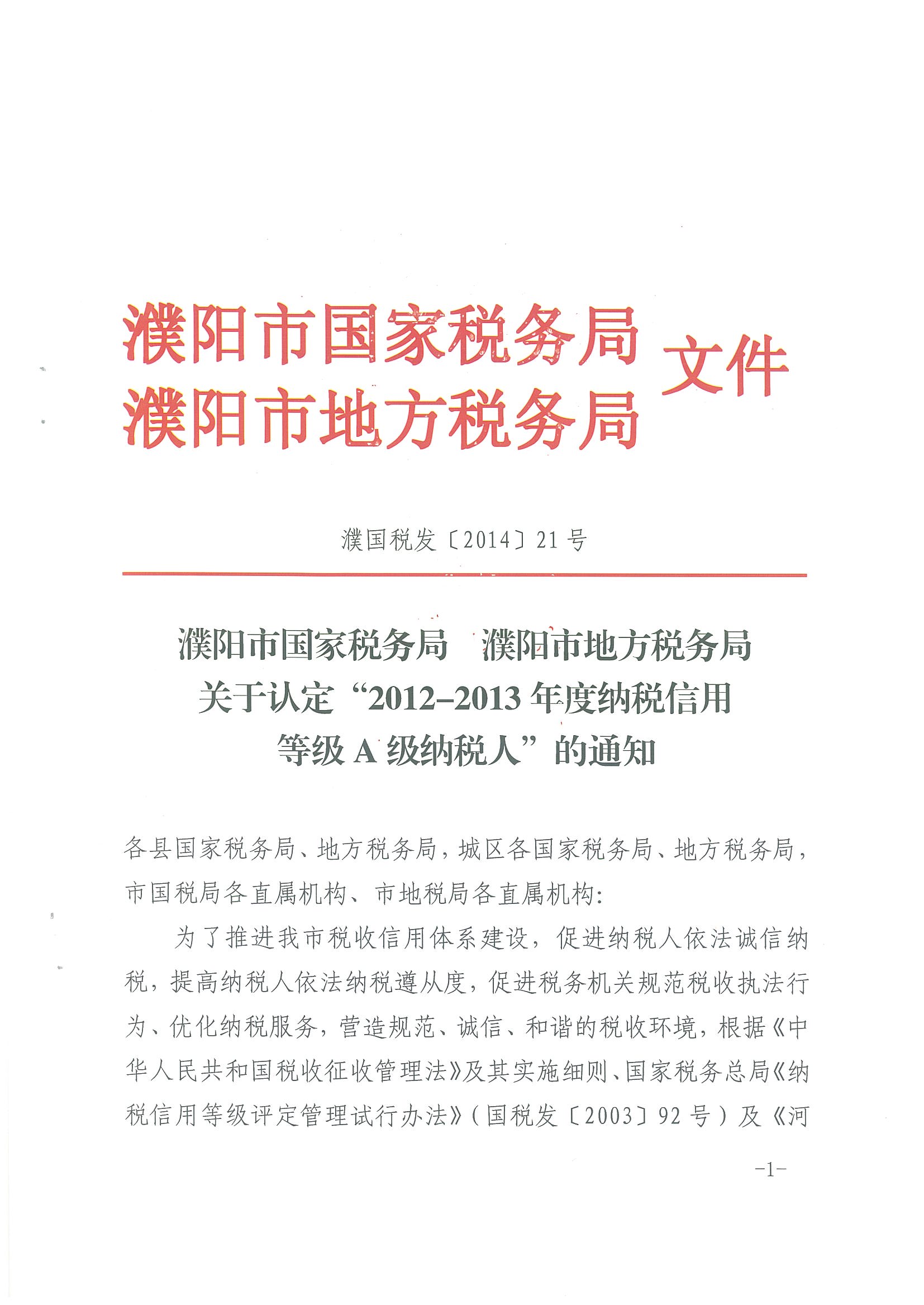 2014年4月,濮陽市國稅局、地稅局對“2012-2013年度納稅信用等級A級納稅人”進行了認定,公司成功獲得“納稅信用等級A級納稅人”這一榮譽稱號。