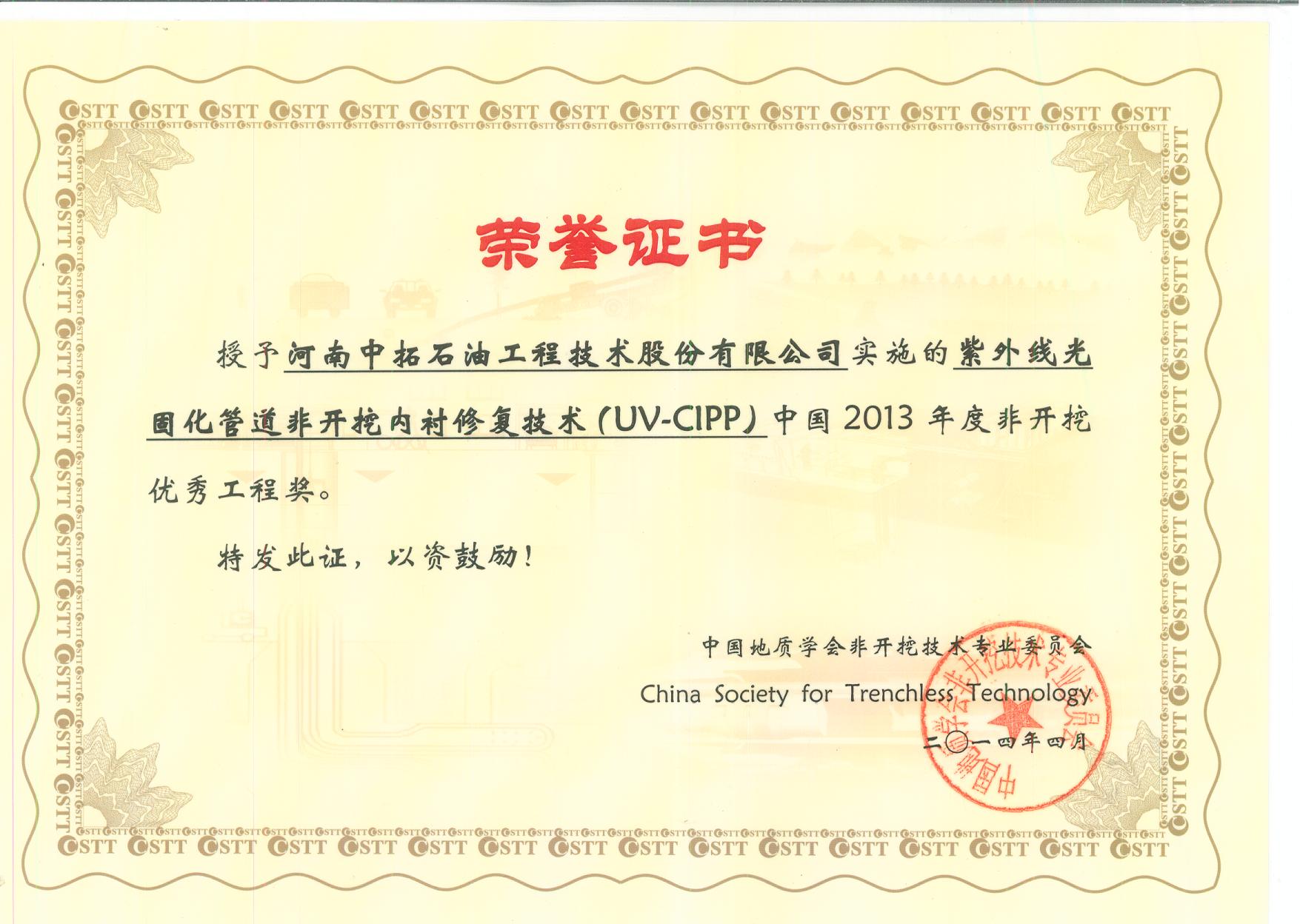 根據協會的安排我公司就《管道替換與修復技術規程》在專題會上進行了宣貫。我公司實施的天津開發區取水管道CIPP內襯修復工程和紫外線光固化管道非開挖內襯修復技術(UV-CIPP)榮獲中國2013年度非開挖優秀工程獎。