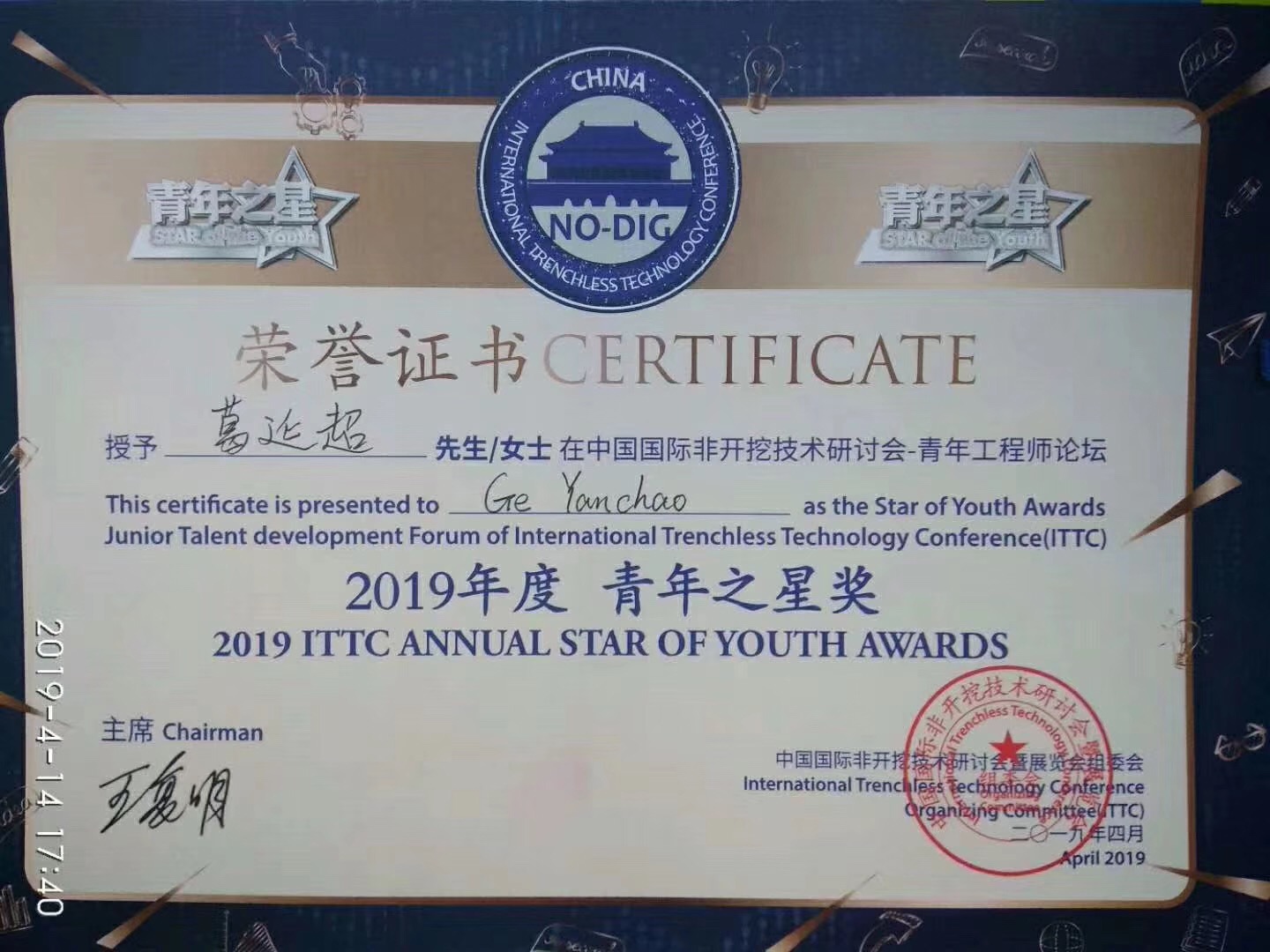 祝賀我公司總工程師葛延超先生獲得中國非開挖協會唯一的青年之星稱號!