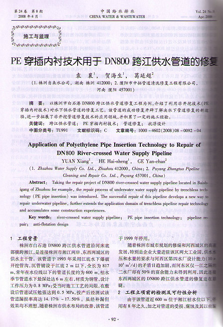 文章題目為《PE穿插內(nèi)襯技術(shù)用于DN800跨獎供水管道的修復》,其文章中主要介紹了在穿插修復大口徑管道的施工方式、技術(shù)舉措和施工過程等。