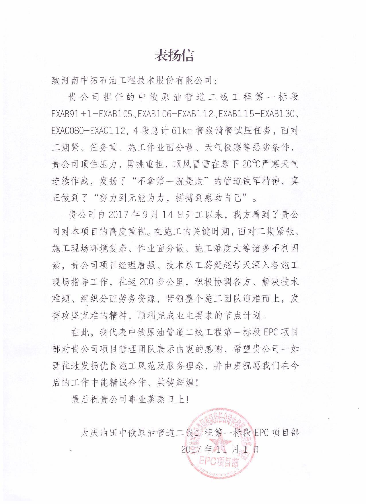 Since the project was launched in June, 2017, face the harsh conditions such as large span of construction, lack of water, scattered construction work and extremely cold weather etc, all the project staffs work together under the leadership of technical engineer Ge Yanchao, and project manager Tang Xin and He Xincai, to work with sincere cooperation, day and night fighting hard to overcome the difficulties, fighting snowstorm, complete the construction tasks excellently. The first and fourth tenders have been highly praised from the owners. All the staffs in the project can respond promptly to each construction, organize meticulously, manage scientifically and construct civilizedly so as to realize standardized management on site. This not only shows the good tradition of our company and the good features of staffs, but also fully embodies and develops "The spirit of Zhongtuo", but also add luster for the national petroleum pipeline construction .